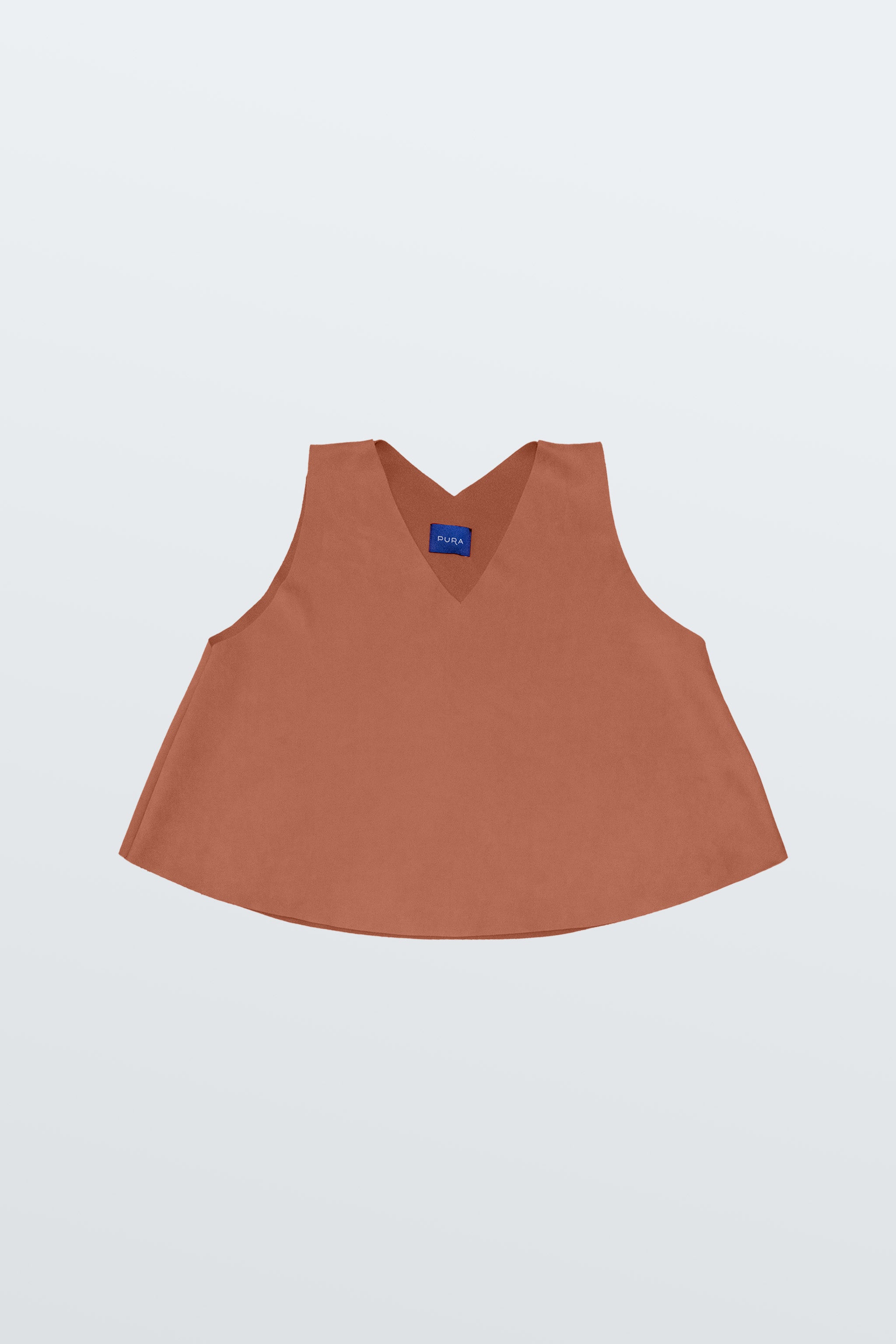 Silueta holgada con escote delantero en V y detalles que aportan fluidez y estructura.