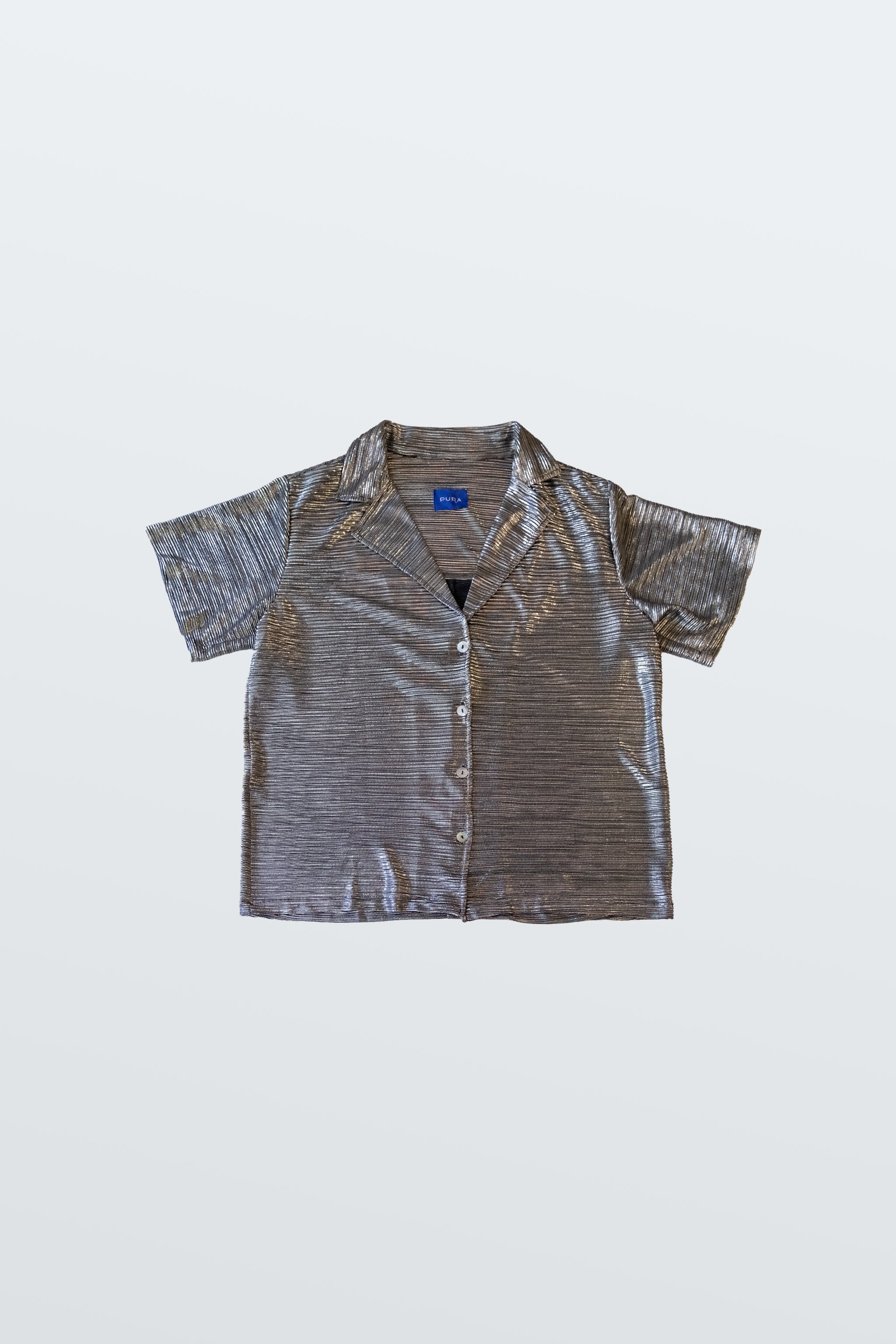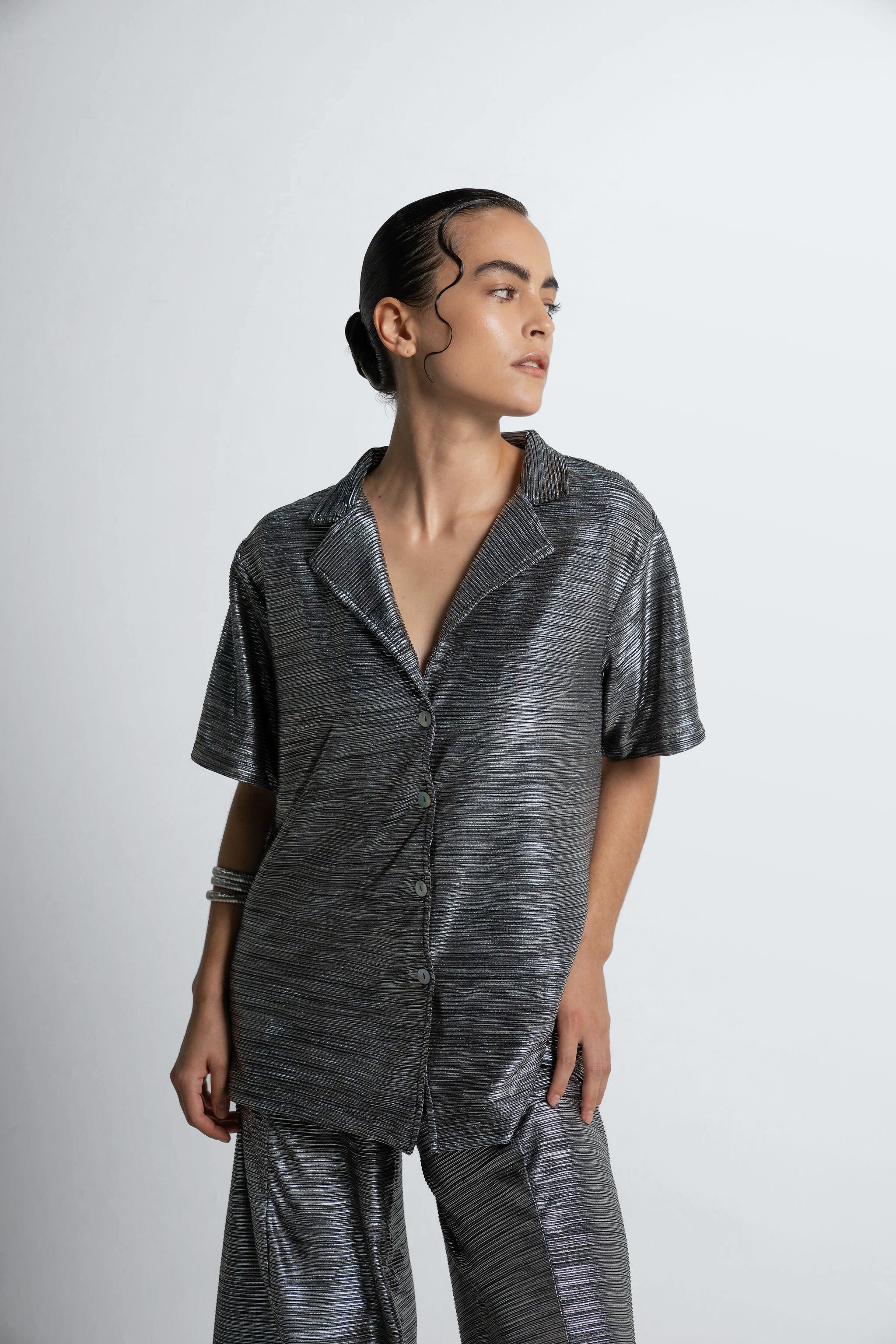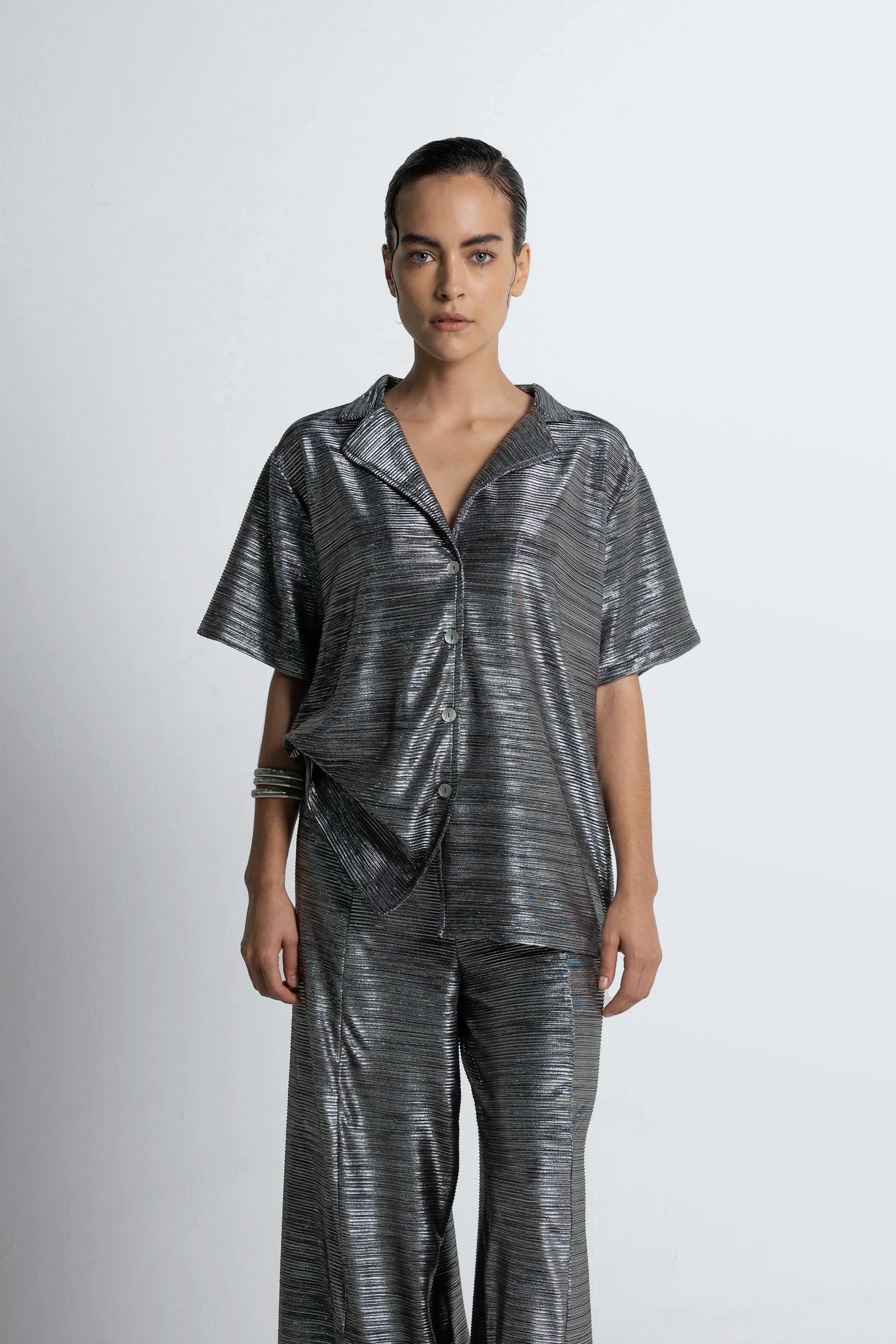 Esta camisa es la perfecta definición de atemporalidad, chicness y comodidad; su silueta es holgada y muy cómoda; es de esas piezas que querrás usar todos los días, con prendas clásicas y otras un poco más formales o tranquilas, no tengas miedo de usar el brillo a tu favor.