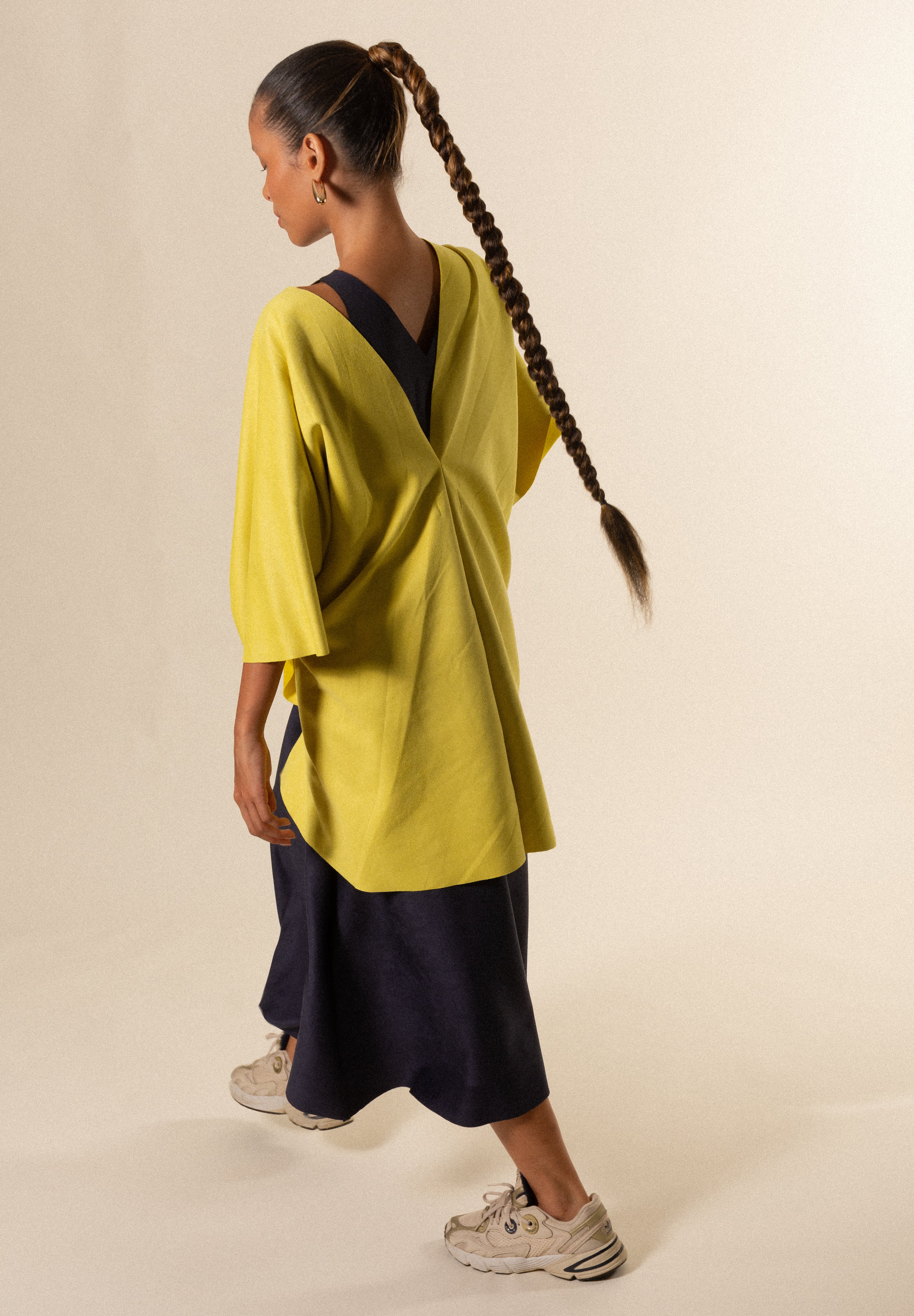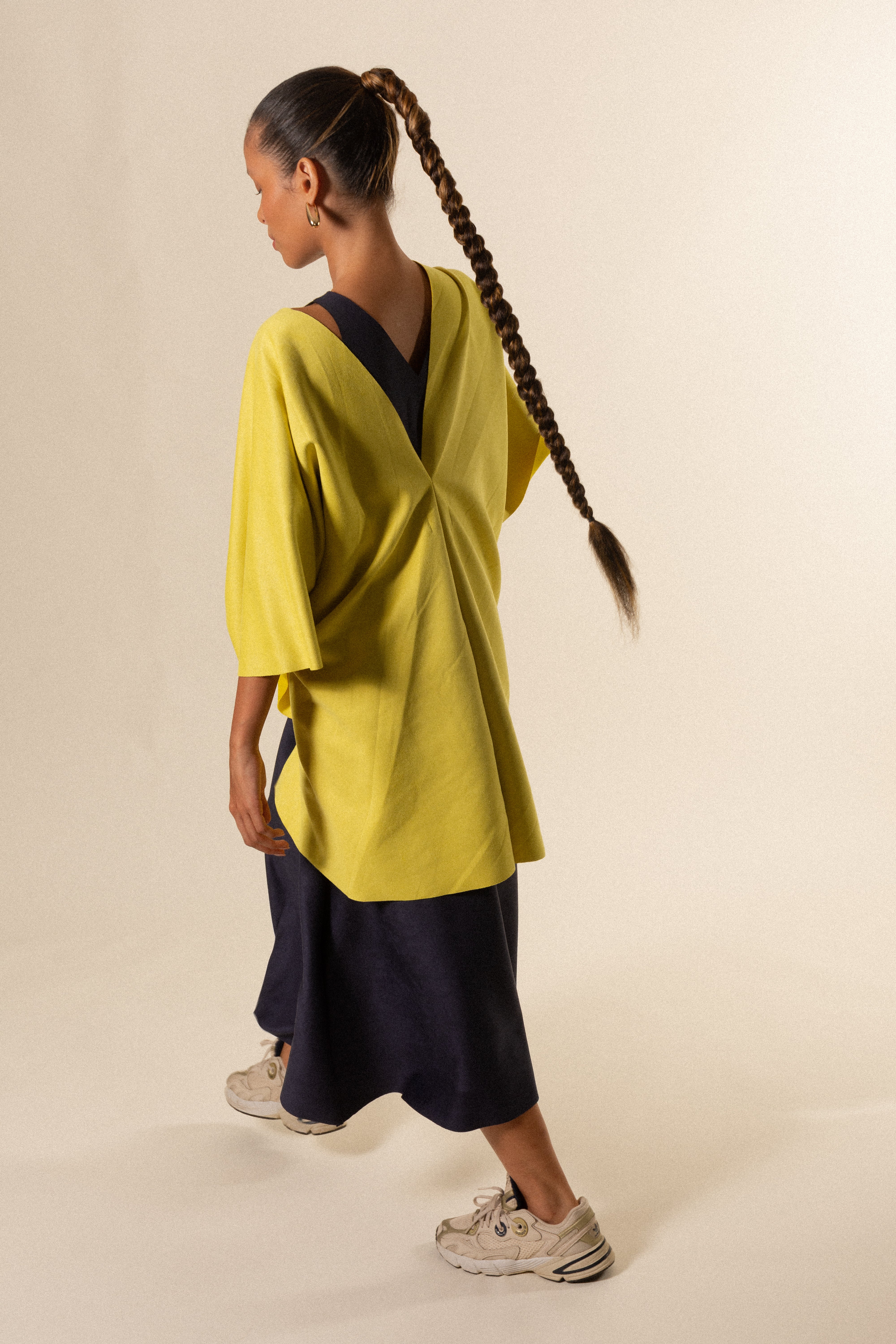 Diseño amplio con mucho vuelo y movimiento, ideal para superponer sobre otras prendas.