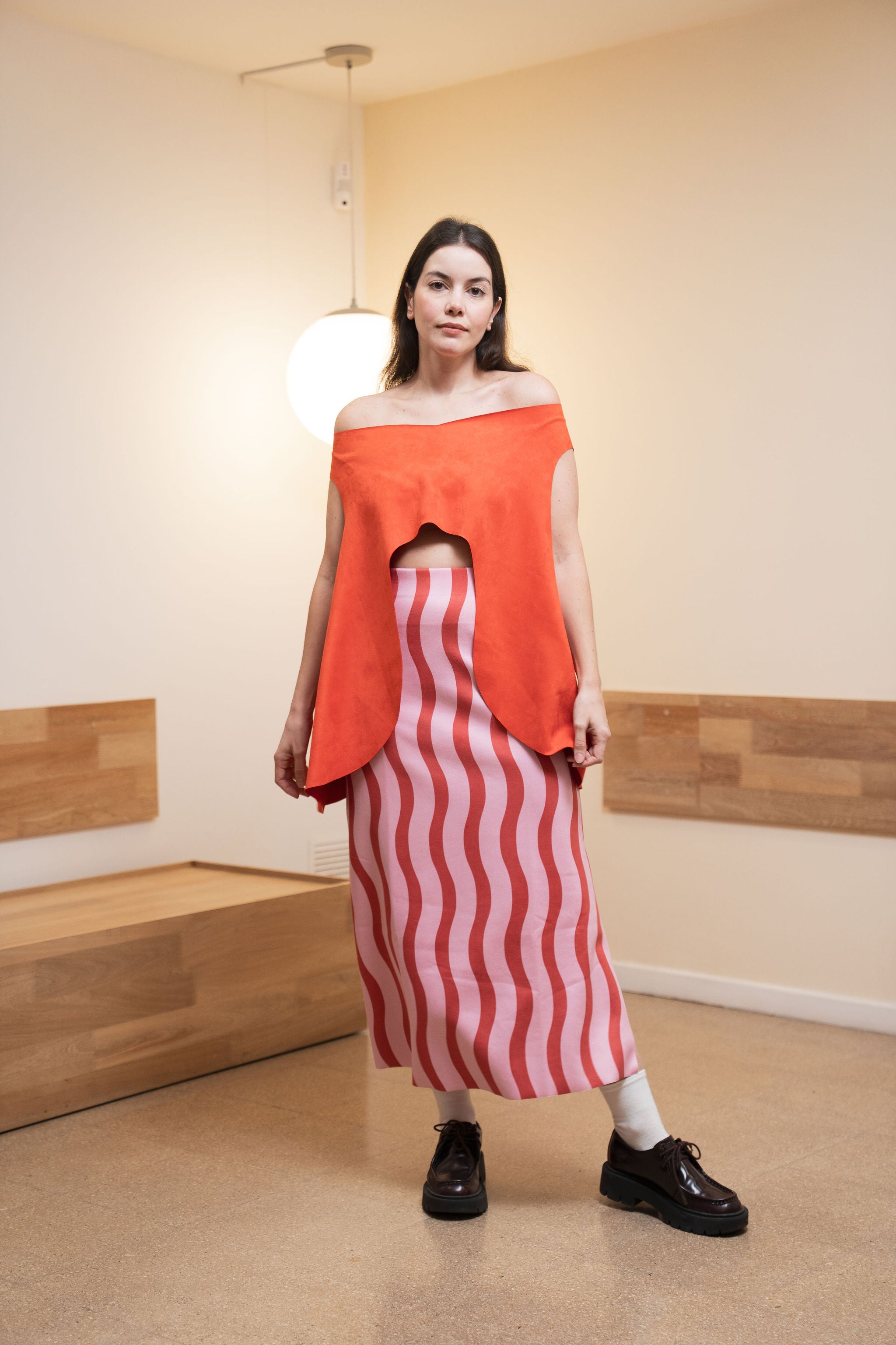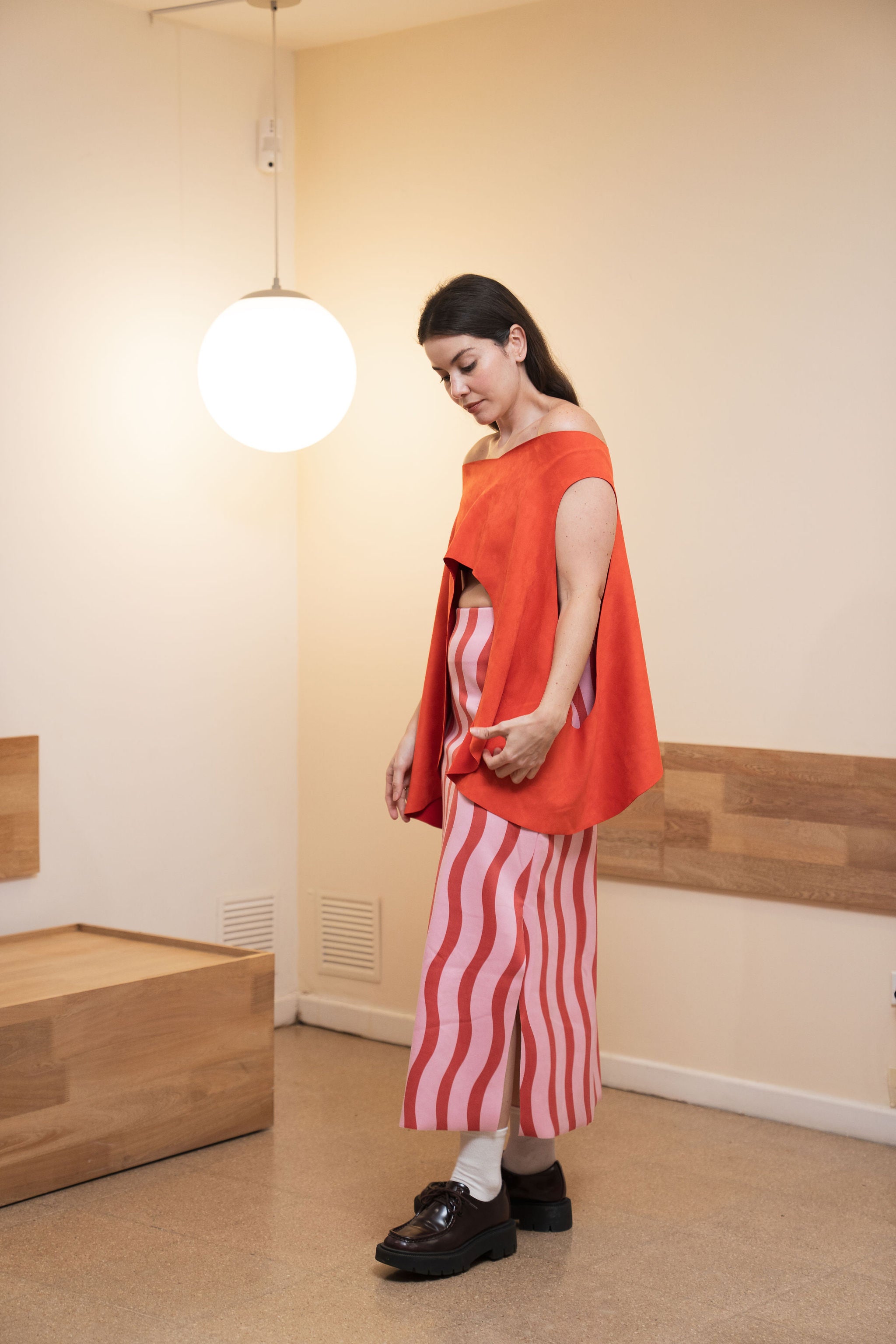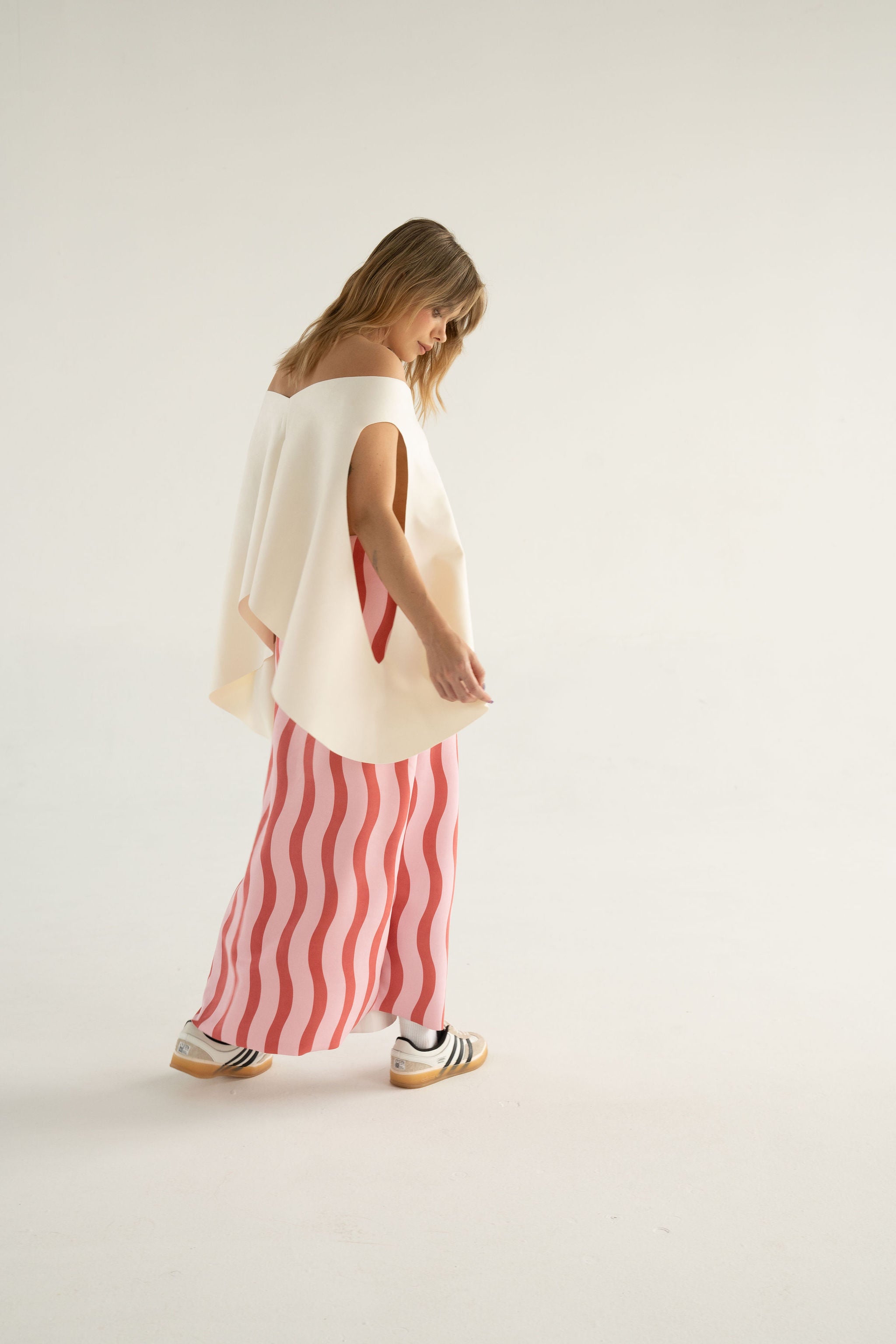 - La modelo mide 1.70 m y está usando una talla 6